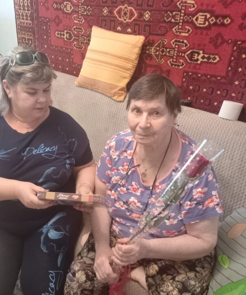 В праздничный день социальный работник Наталья Каленчук пришла лично поздравить именинницу, вручила ей подарки и самые теплые и сердечные поздравления от всего нашего коллектива. Мы в свою очередь желаем Валентине Федоровне крепкого здоровья, душевного тепла и отличного настроения!